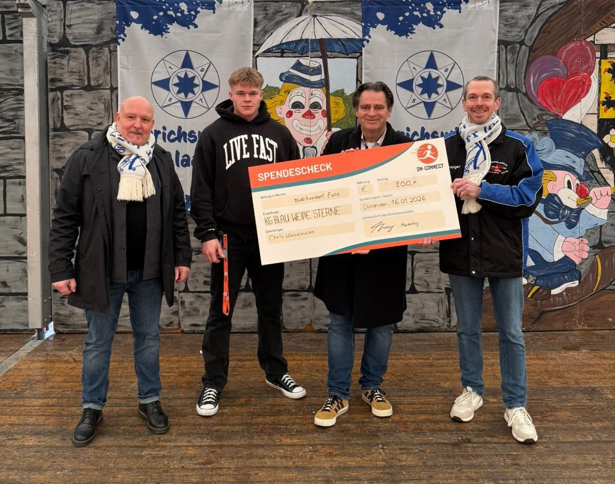 Derichsweiler, Januar 2026: Als regionaler FTTH-Netzbetreiber setzt sich DN-CONNECT nicht nur für zukunftssichere digitale Infrastruktur ein, sondern unterstützt auch das Vereinsleben vor Ort. Am Freitag, 16. Januar 2026, überreichte DN-CONNECT eine Spende in Höhe von 200 € an die Karnevalsgesellschaft Blau-Weiße-Sterne Derichsweiler 1957 e.V.