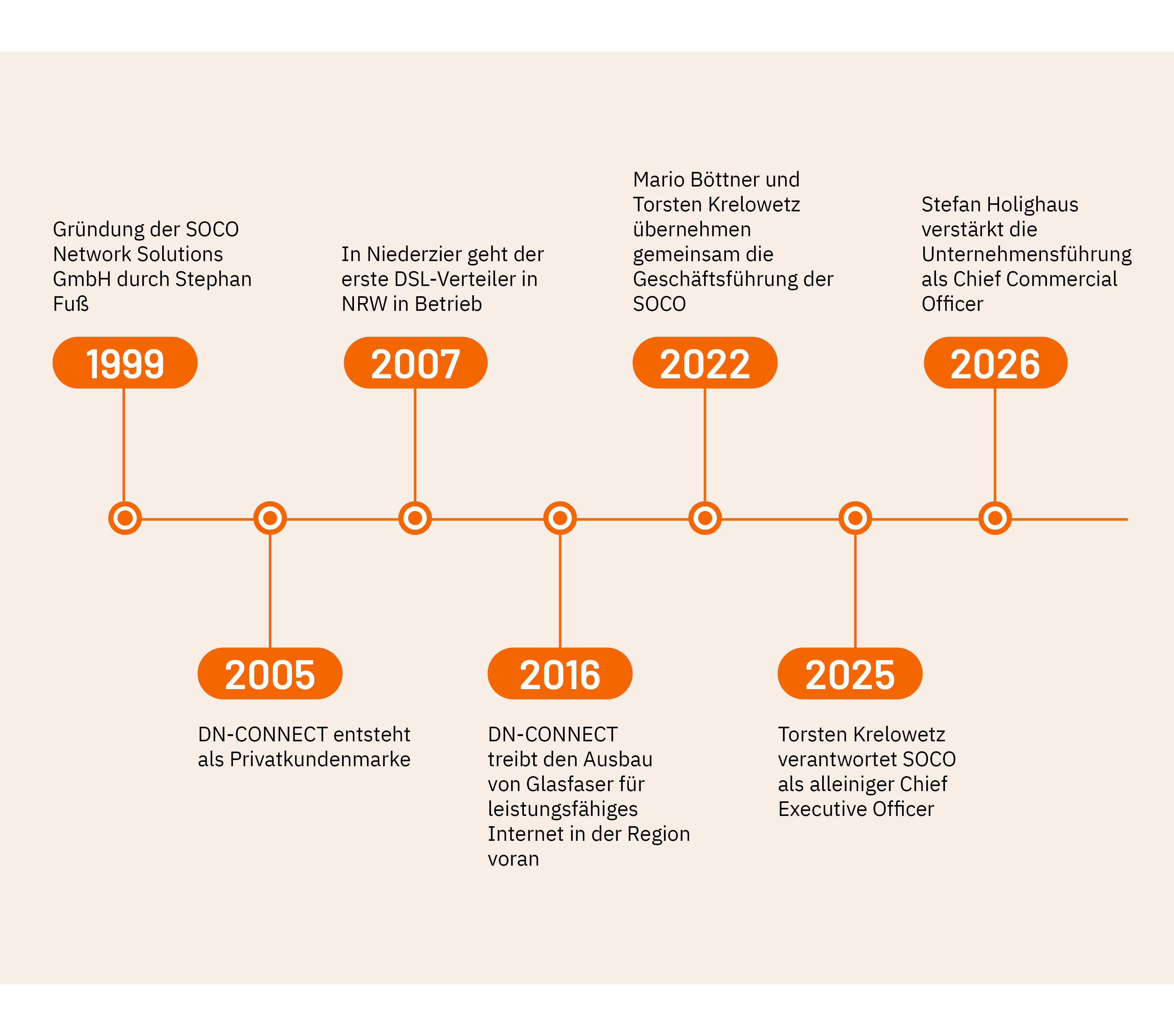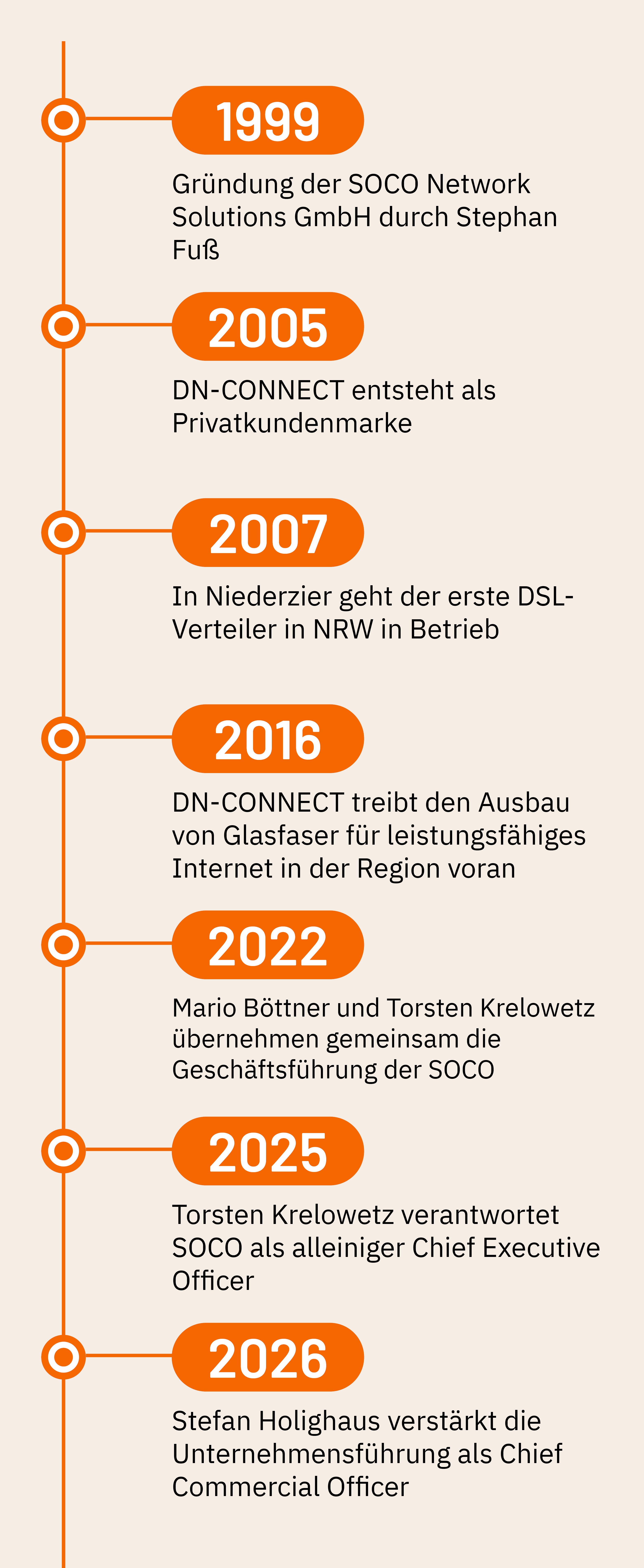 Seit 1999 arbeitet die SOCO Network Solutions GmbH daran, den Kreis Düren mit leistungsfähigem Internet zu versorgen. Was mit der Gründung durch Stephan Fuß begann, wurde 2005 mit der Privatkund/innenmarke DN-CONNECT sichtbar. Vom ersten eigenen DSL-Verteiler in Niederzier bis zum konsequenten Glasfaserausbau für Gigabitinternet zeigt unsere Historie, wie wir Städte und Dörfer in der Region Schritt für Schritt digital voranbringen.